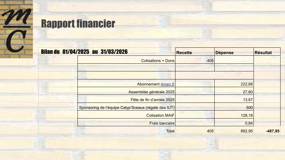 Le rapport financier de la période du 01/04/2025 au 31/03/2026 a ensuite été présenté par SAUCY Benjamin en sa qualité de trésorier de l’AAAEMCS. Celui-ci est consultable dans le fichier nommé : “Support AGO_11042026”, qui sera joint au présent rapport lors de la diffusion de celui-ci aux adhérents via leur adresse mail.